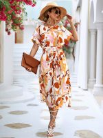 Summer Print Short-sleeved Dress Summer Loose Lace-up A-line Long Dresses Fashion Casual Holiday Beach Dress For Womens Clothing