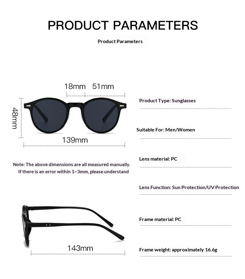 Color: Black frame with gray lenses, transparent gray frame with gray lenses, brown frame with brown lenses, transparent green frame with gray lenses