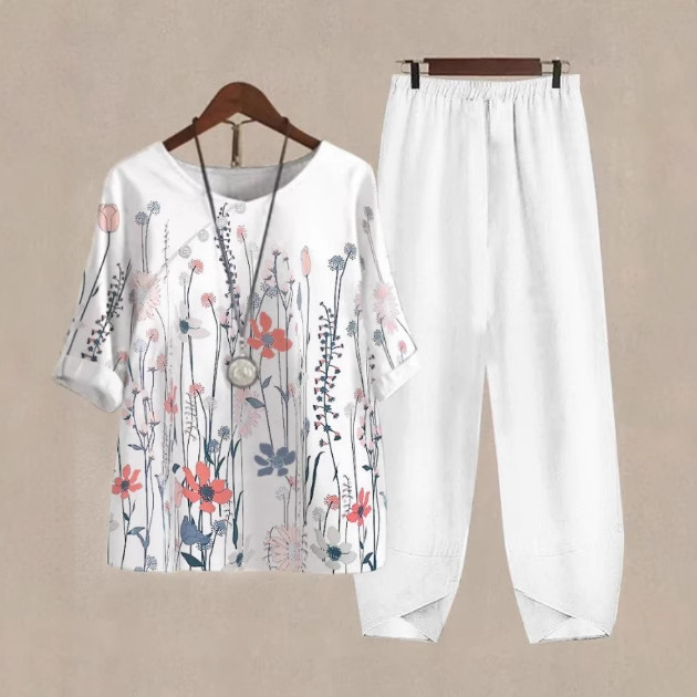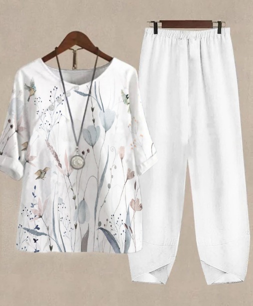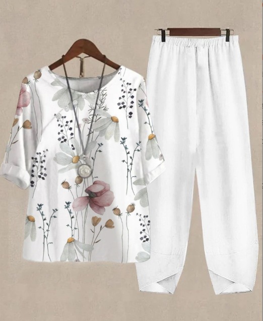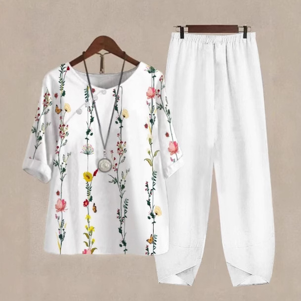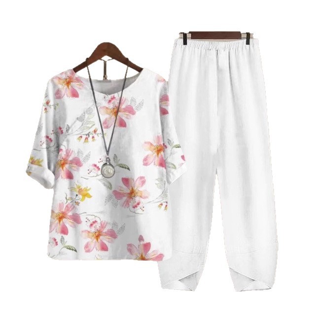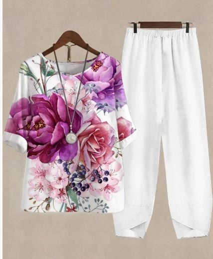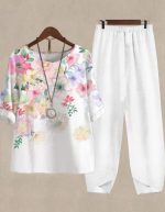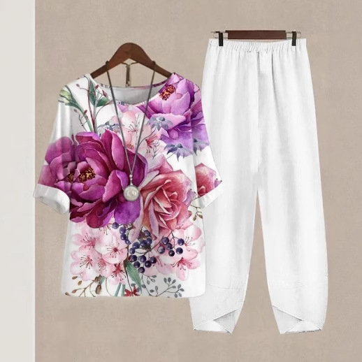 Womens Casual Crew-Neck Cropped-Sleeve Top Set