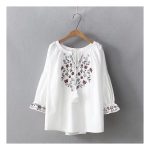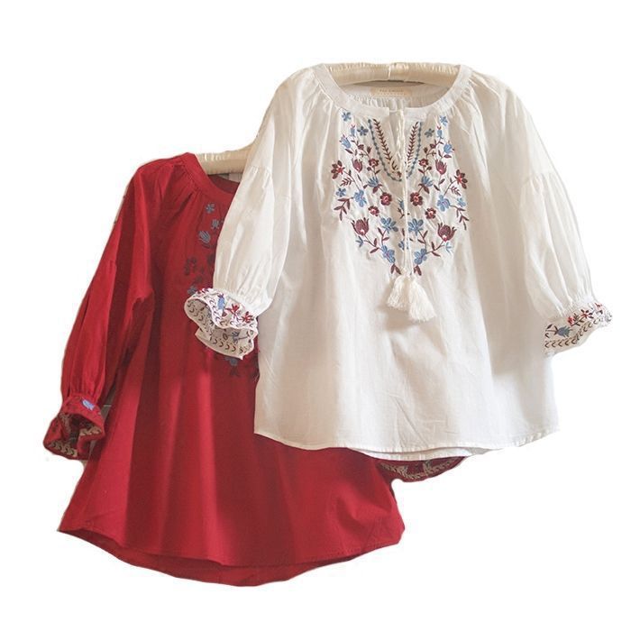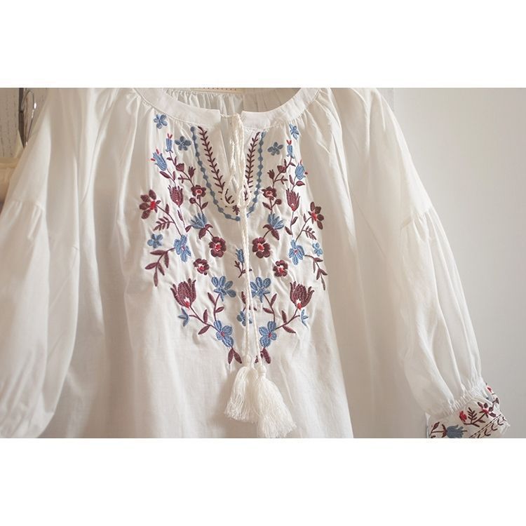 Womens Embroidered Lace-Trimmed Collar Puff-Sleeve TopBlouse