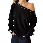 Womens Knitted Top With Rivet-Embellished Slanted Shoulders And Long Sleeves