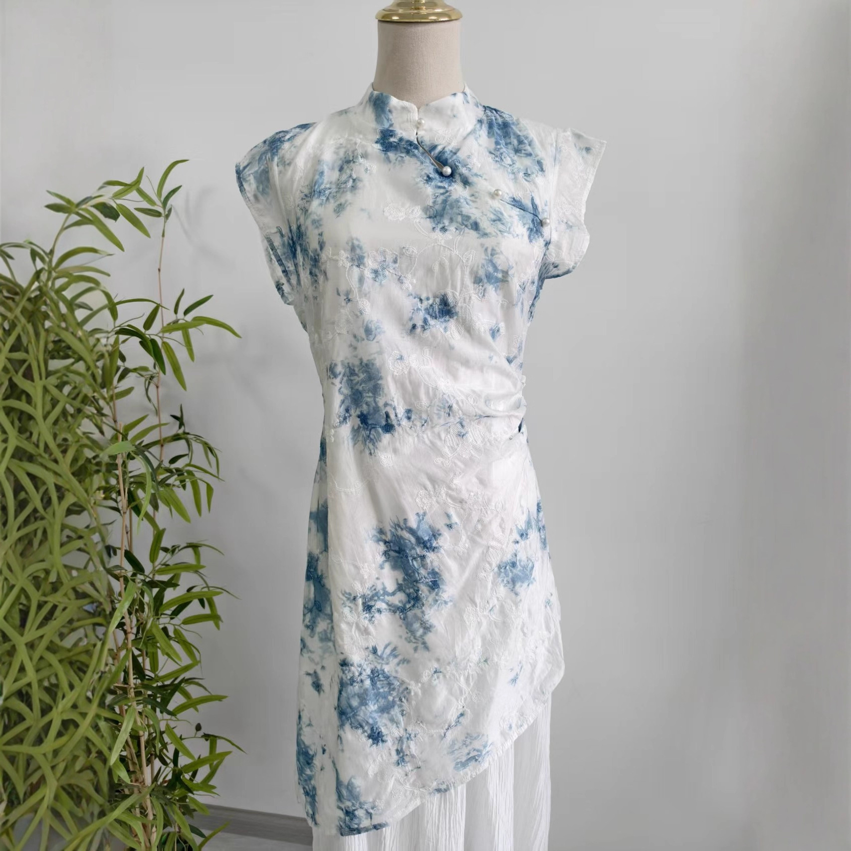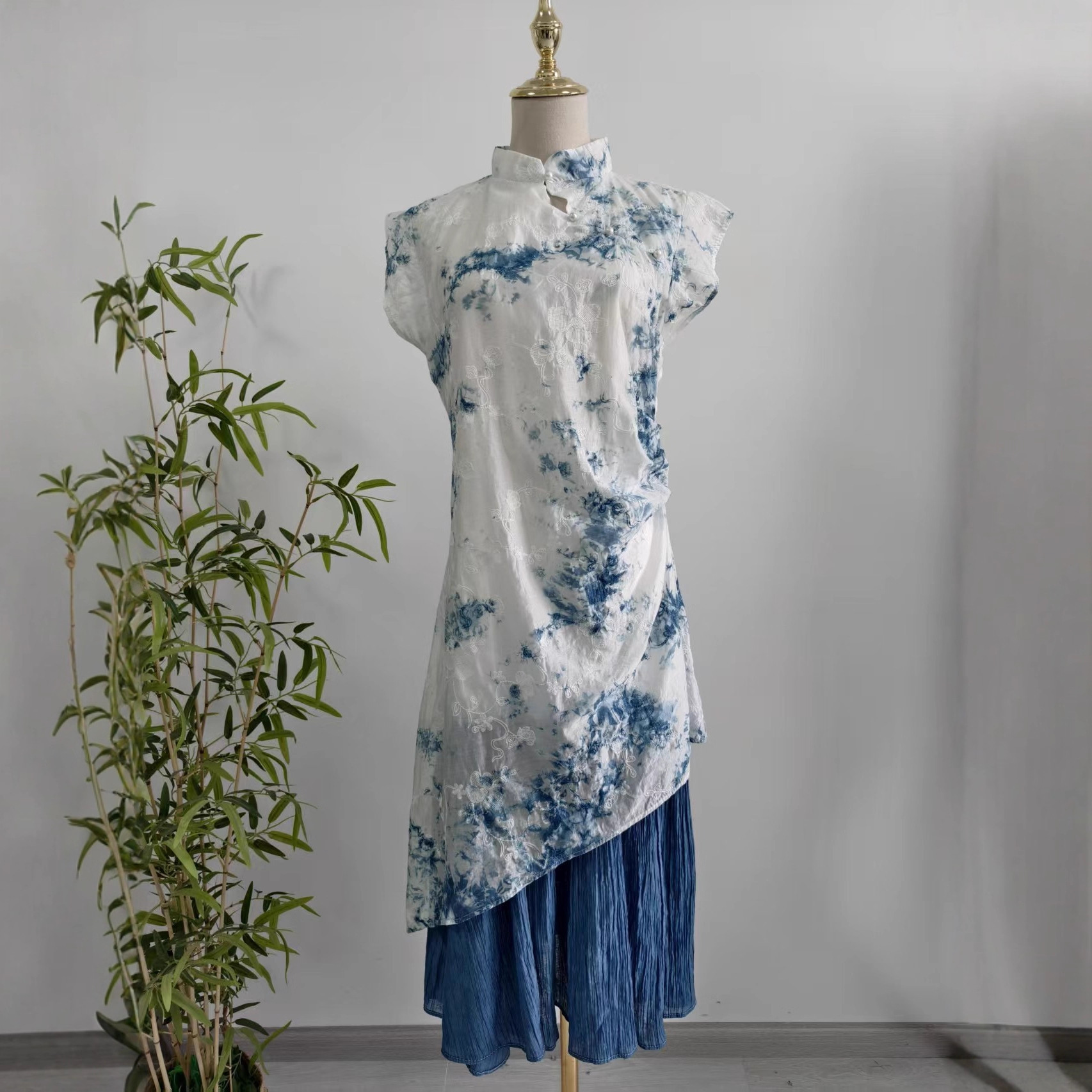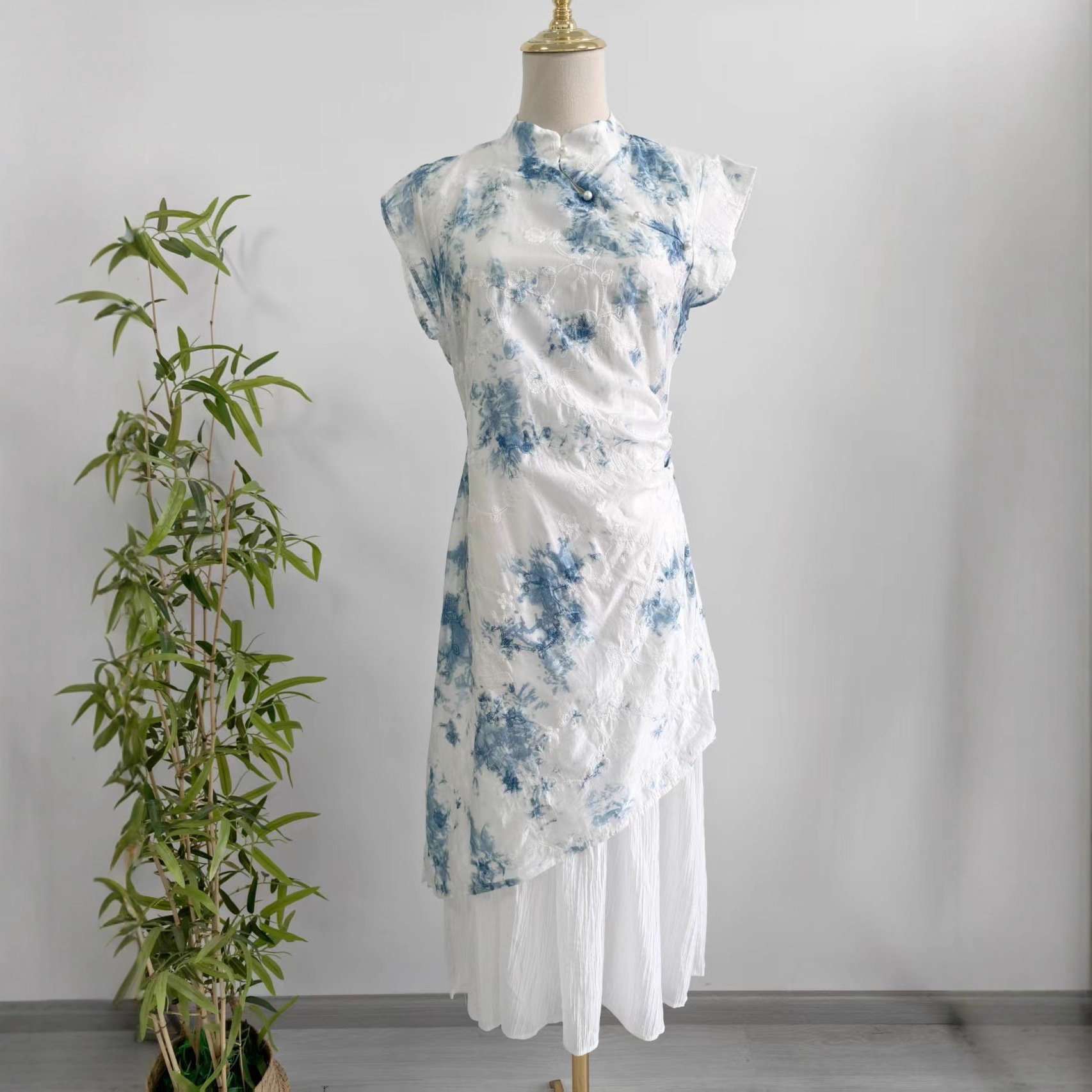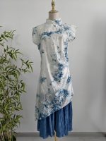 Womens New Chinese-Style Embroidered Tie-Dye Dress With A Stand Collar