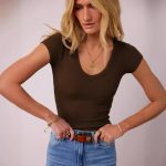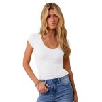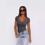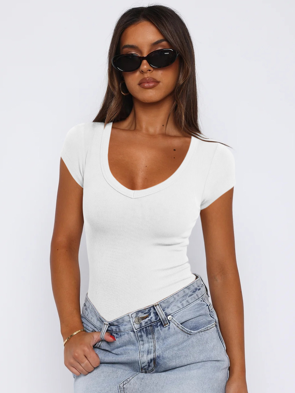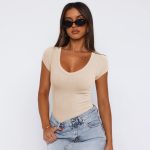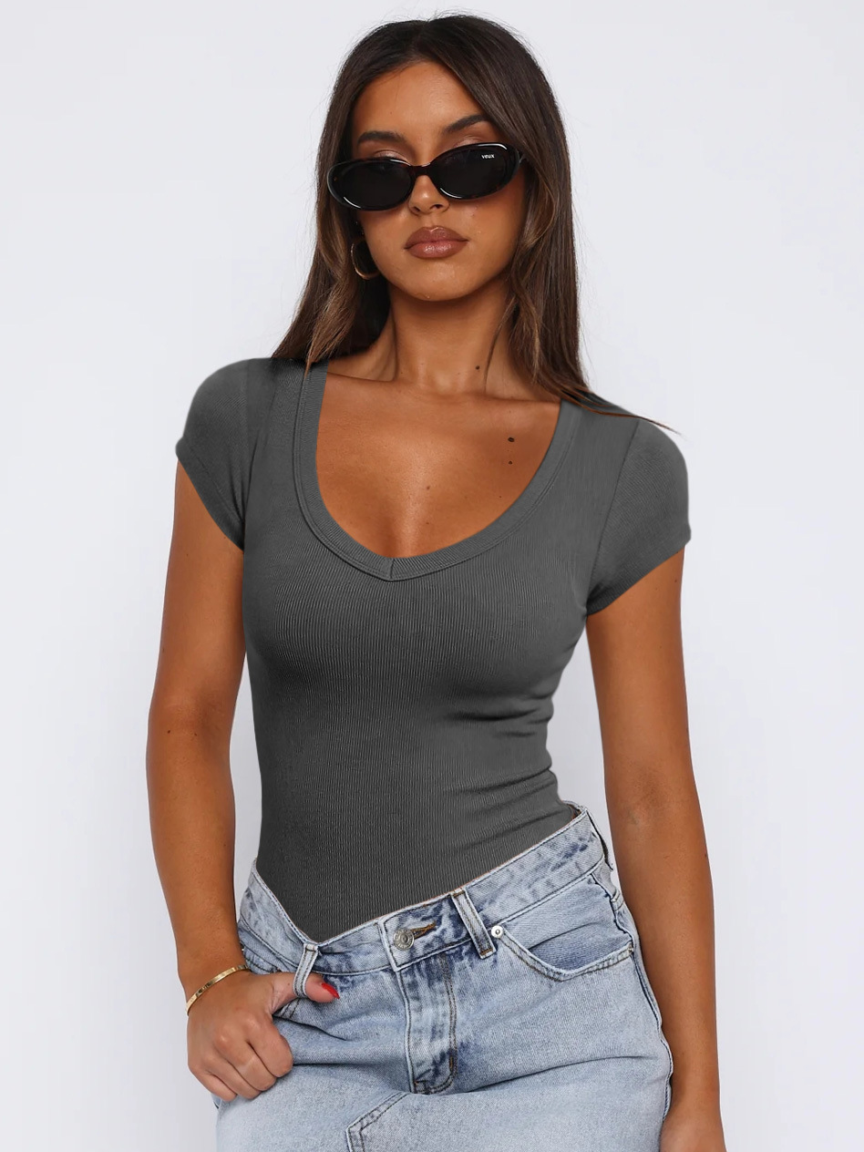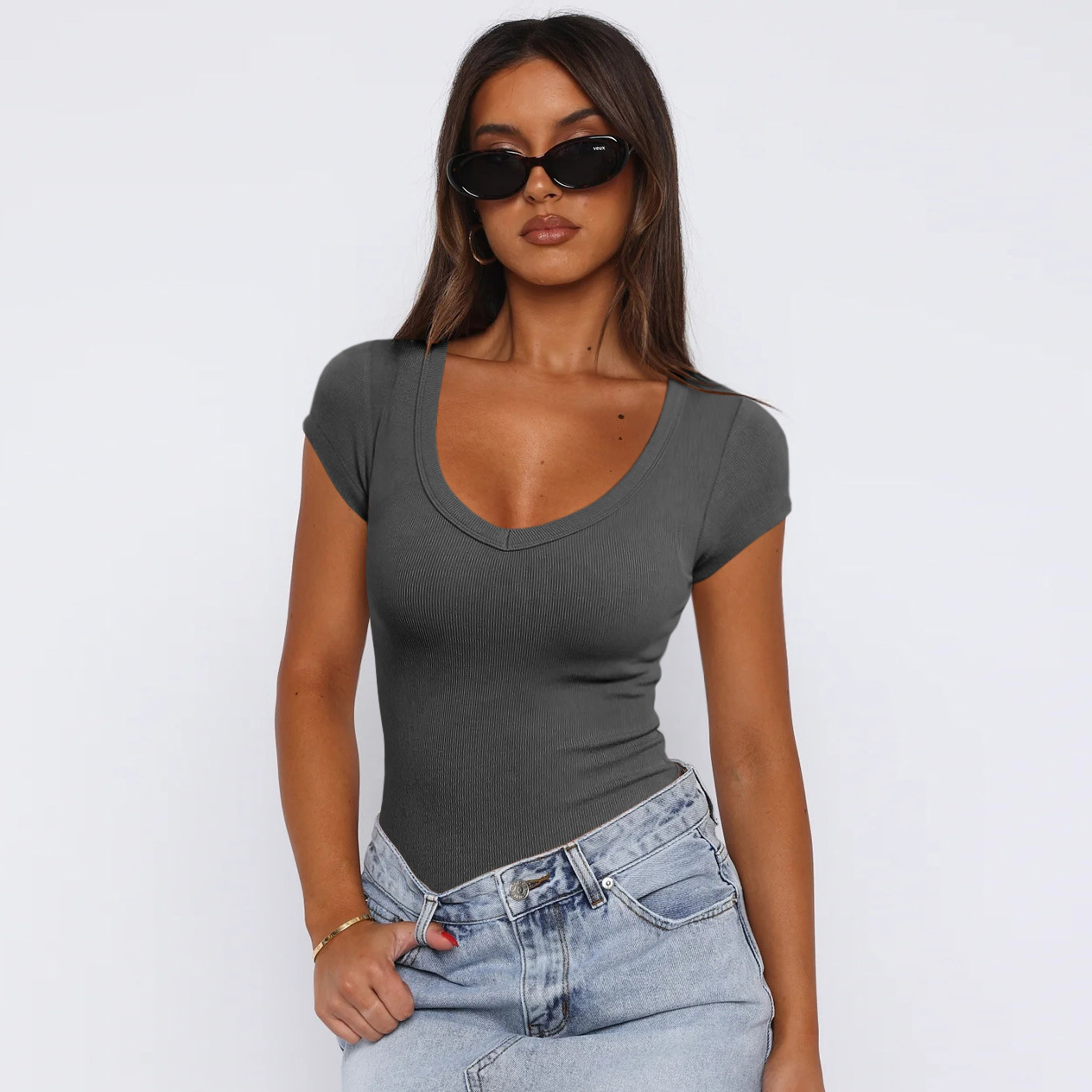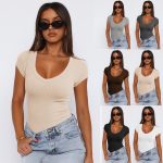 Womens Ribbed Pullover Solid Color Versatile And Stylish Short Sleeves