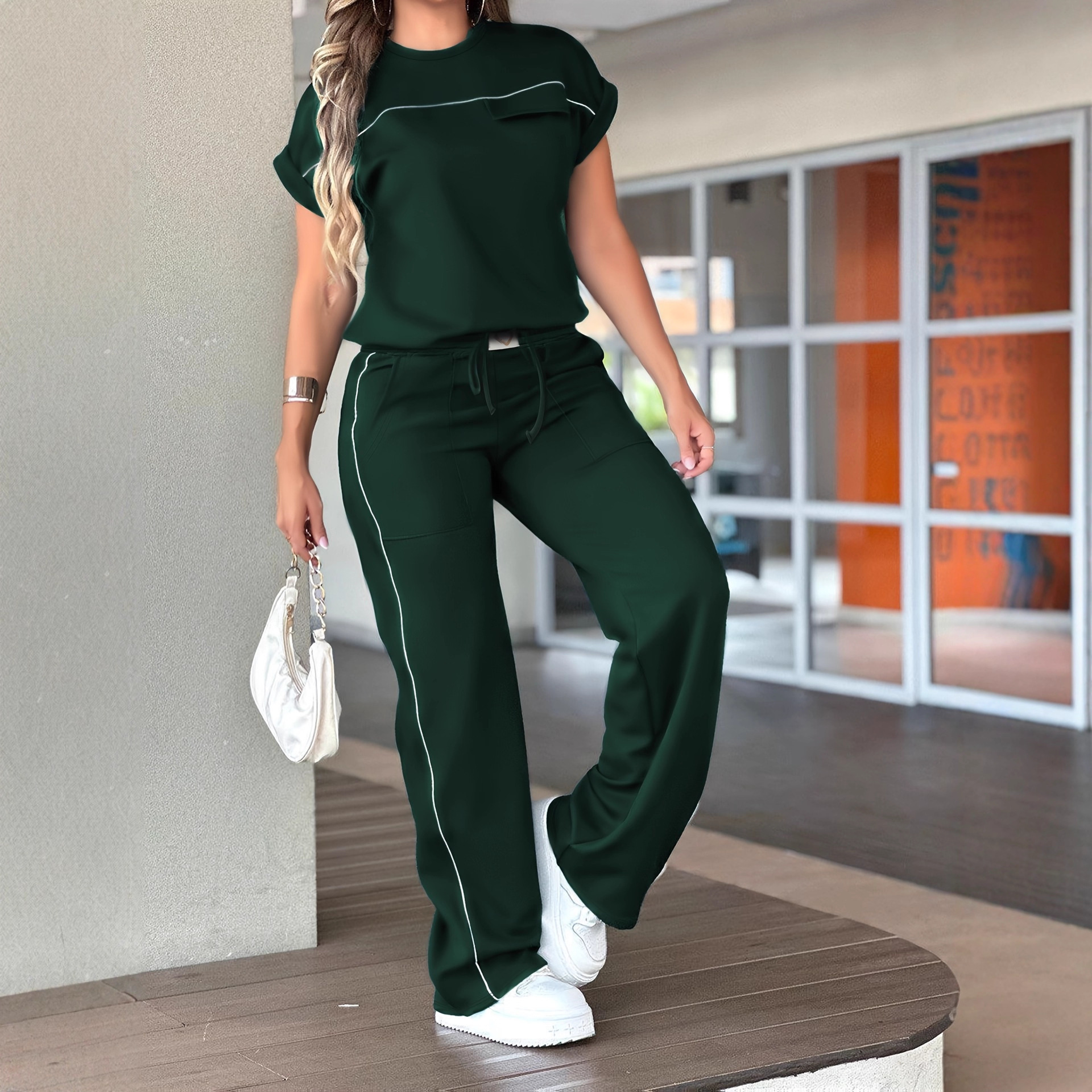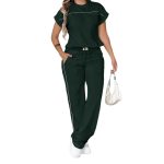 Womens Solid-Color Simple Crew-Neck Short-Sleeve Top And Straight-Leg Pants Set