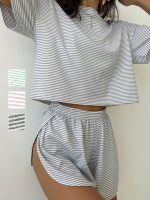 Women’s Striped Casual Short-sleeved Top With Side Slit Shorts Set