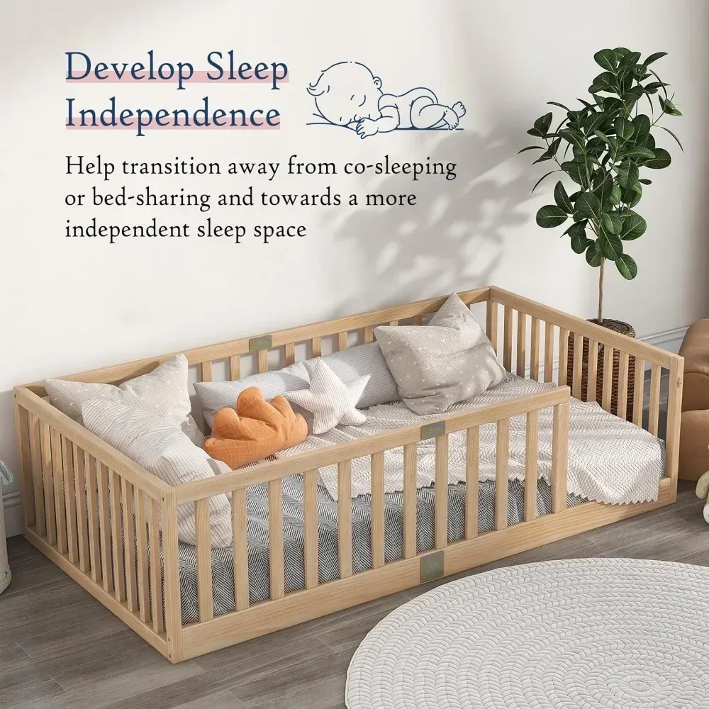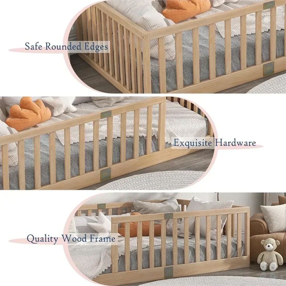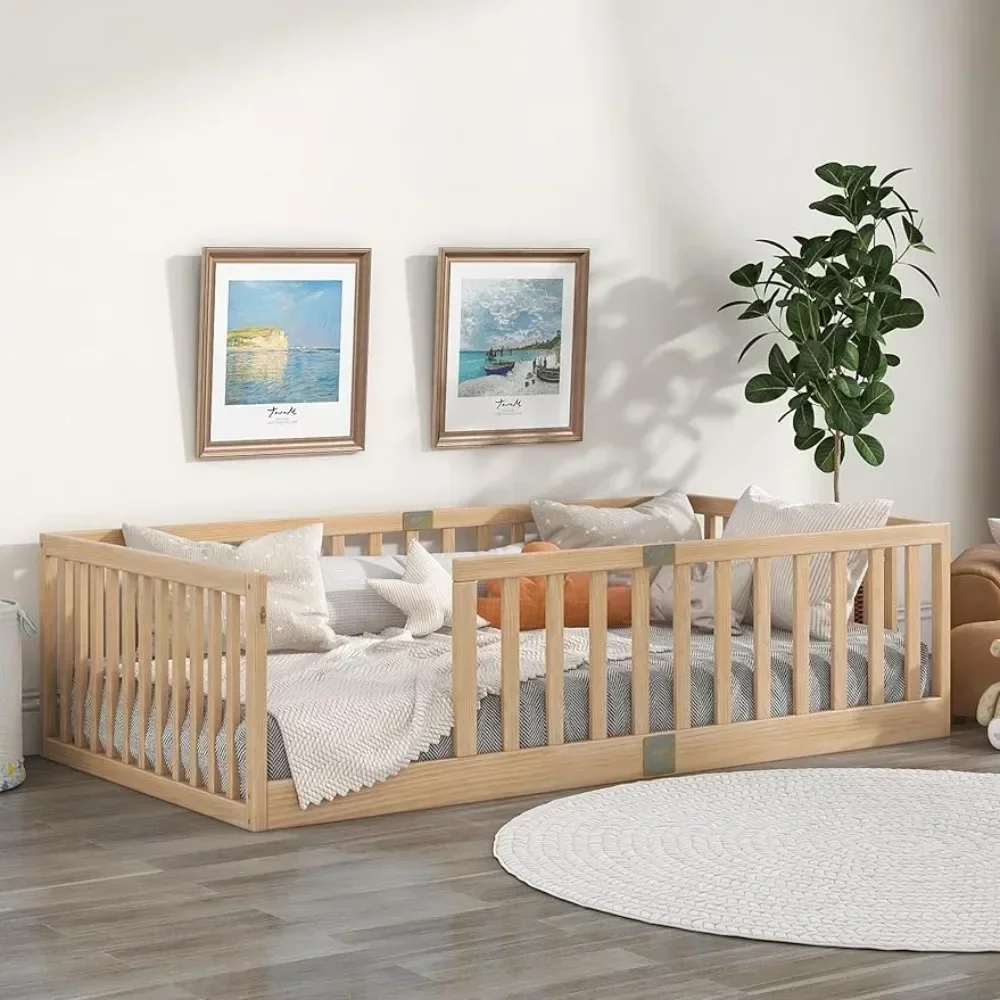 y Twin beds with safety rails, children’s Montessori floor beds, wooden children’s floor bed frames