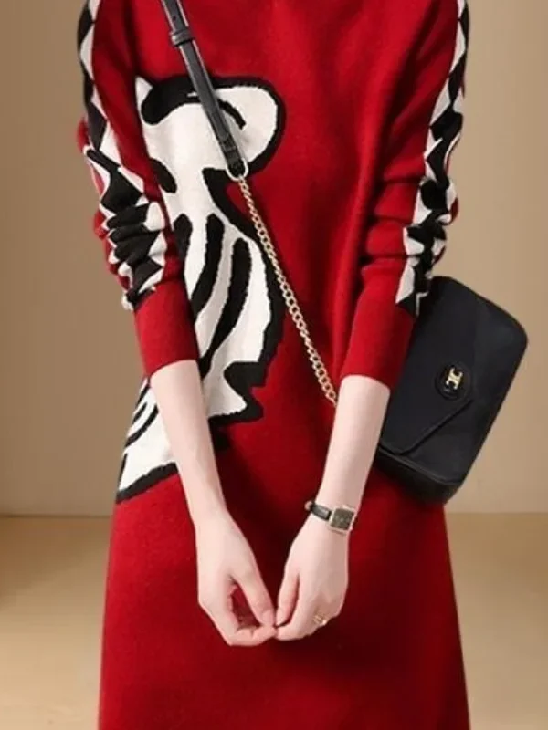 Women’s Knitted Sweater Dress – Autumn/Winter Elegant Pullover with Printed Panels, Round Neck & Long Sleeves | Loose Casual Fit